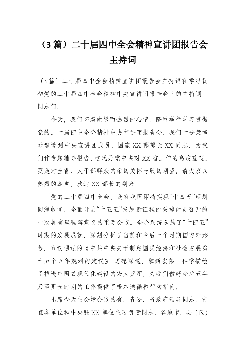 (3篇)二十届四中***精神宣讲团报告会主持词
