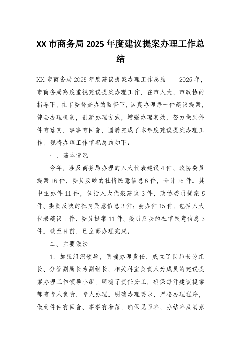 XX市商务局2025年度建议提案办理工作总结