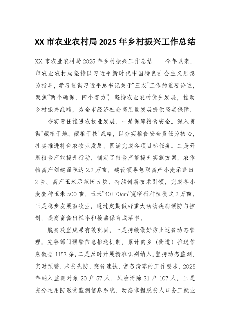 XX市农业农村局2025年乡村振兴工作总结