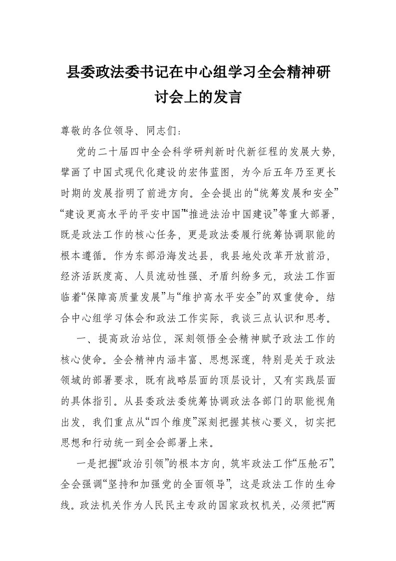 县委政法委书记在中心组学习***精神研讨会上的发言