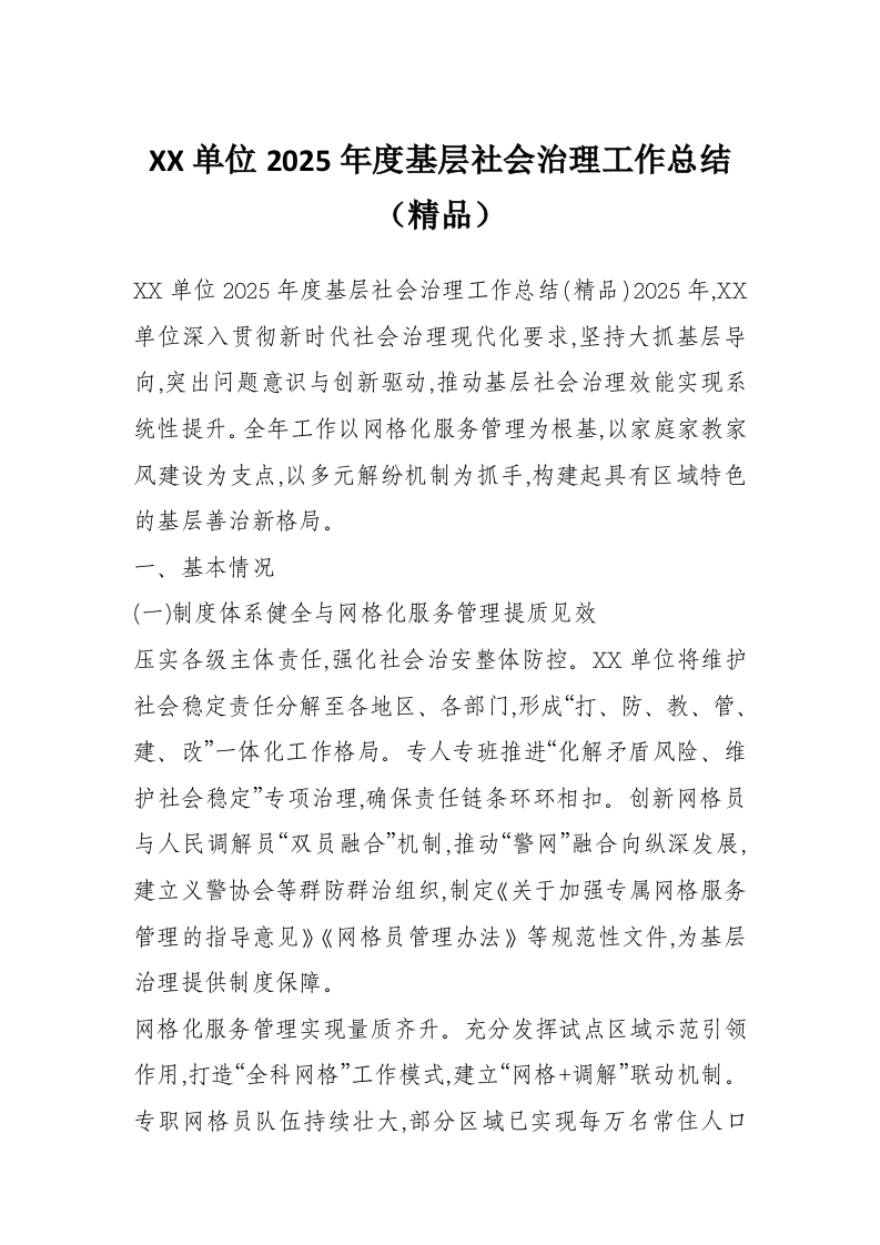 首页学习提升XX单位2025年度基层社会治理工作总结(精品)
