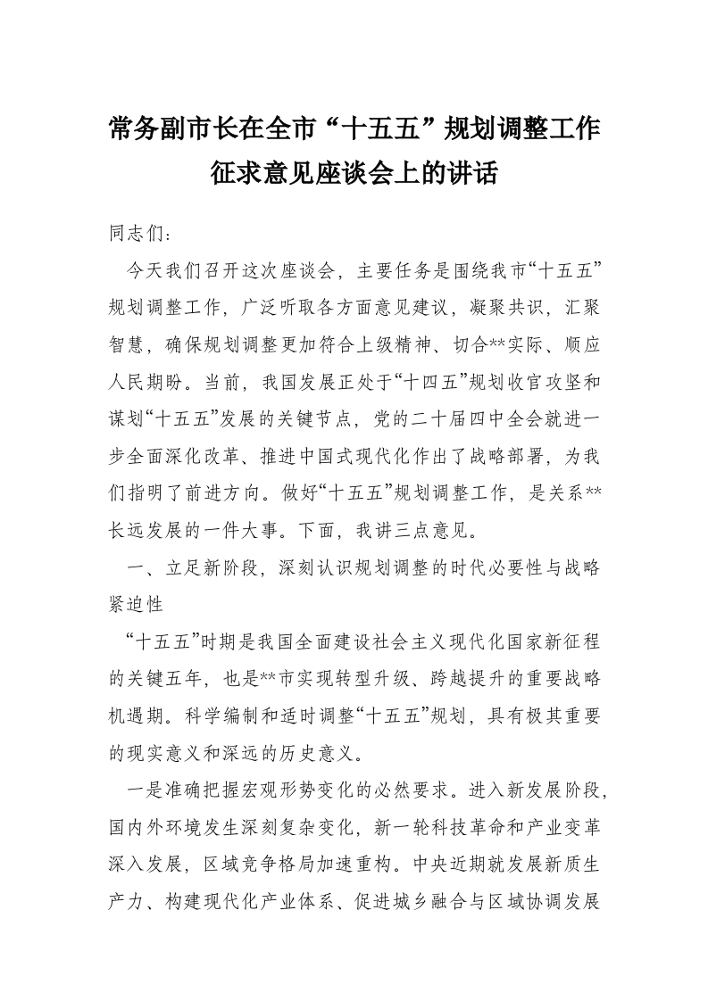 常务副市长在全市“十五五”规划调整工作征求意见座谈会上的讲话
