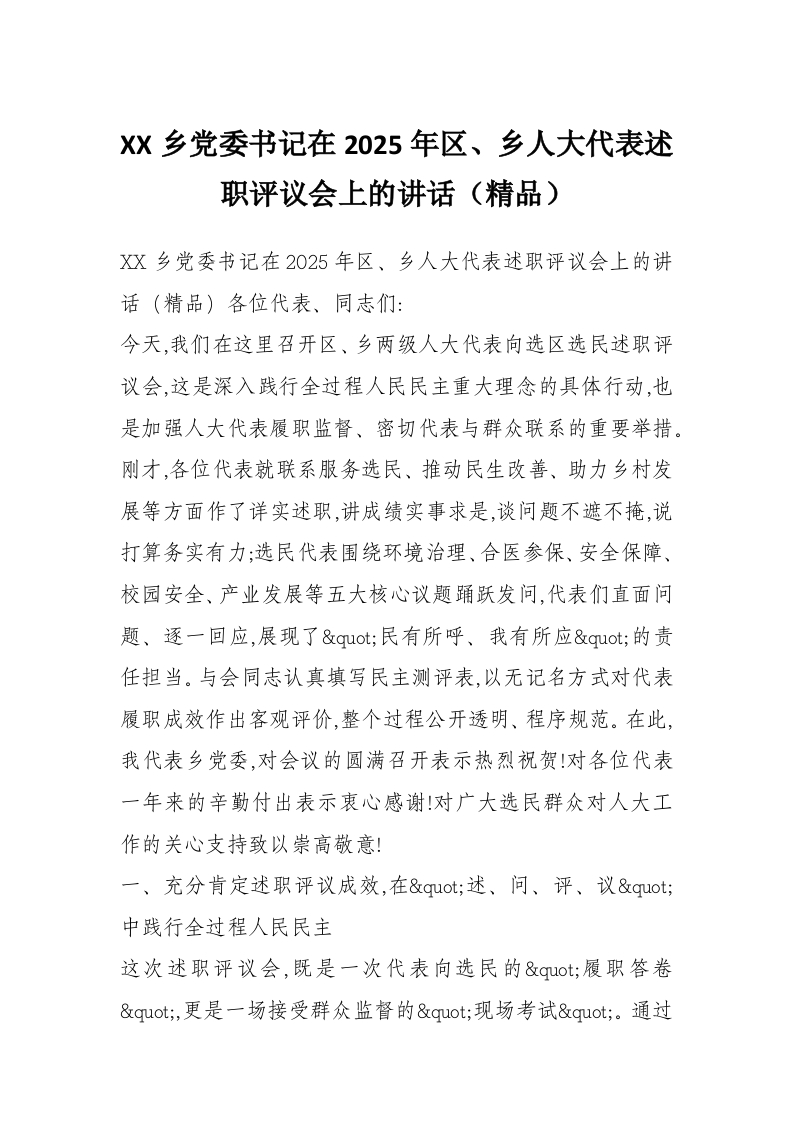 XX乡党委书记在2025年区、乡人大代表述职评议会上的讲话(精品)