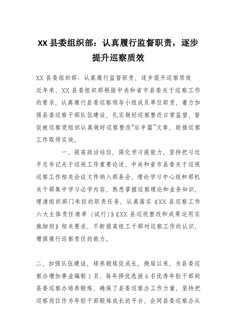 XX县委组织部:认真履行监督职责,逐步提升巡察质效