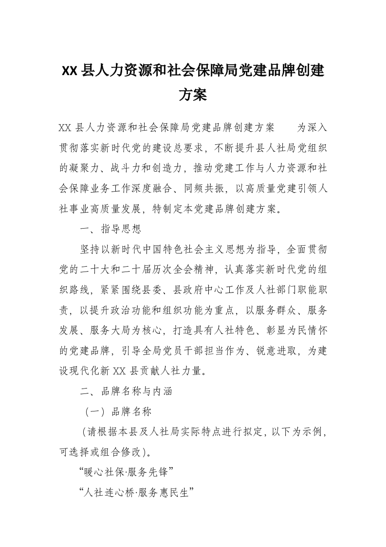 XX县人力资源和社会保障局党建品牌创建方案