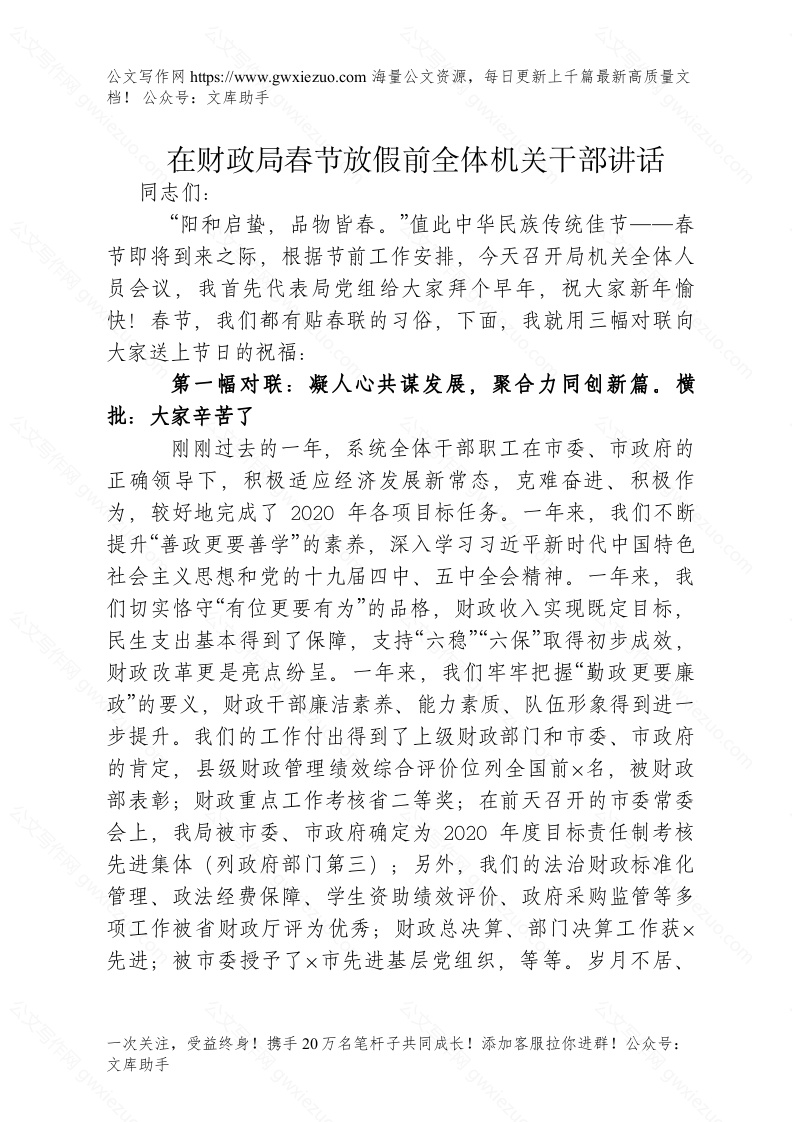首页材料汇编在财政局春节放假前全体机关干部讲话
