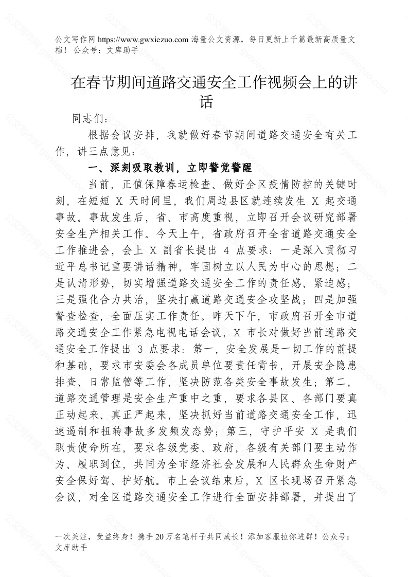 首页材料汇编在春节期间道路交通安全工作视频会上的讲话