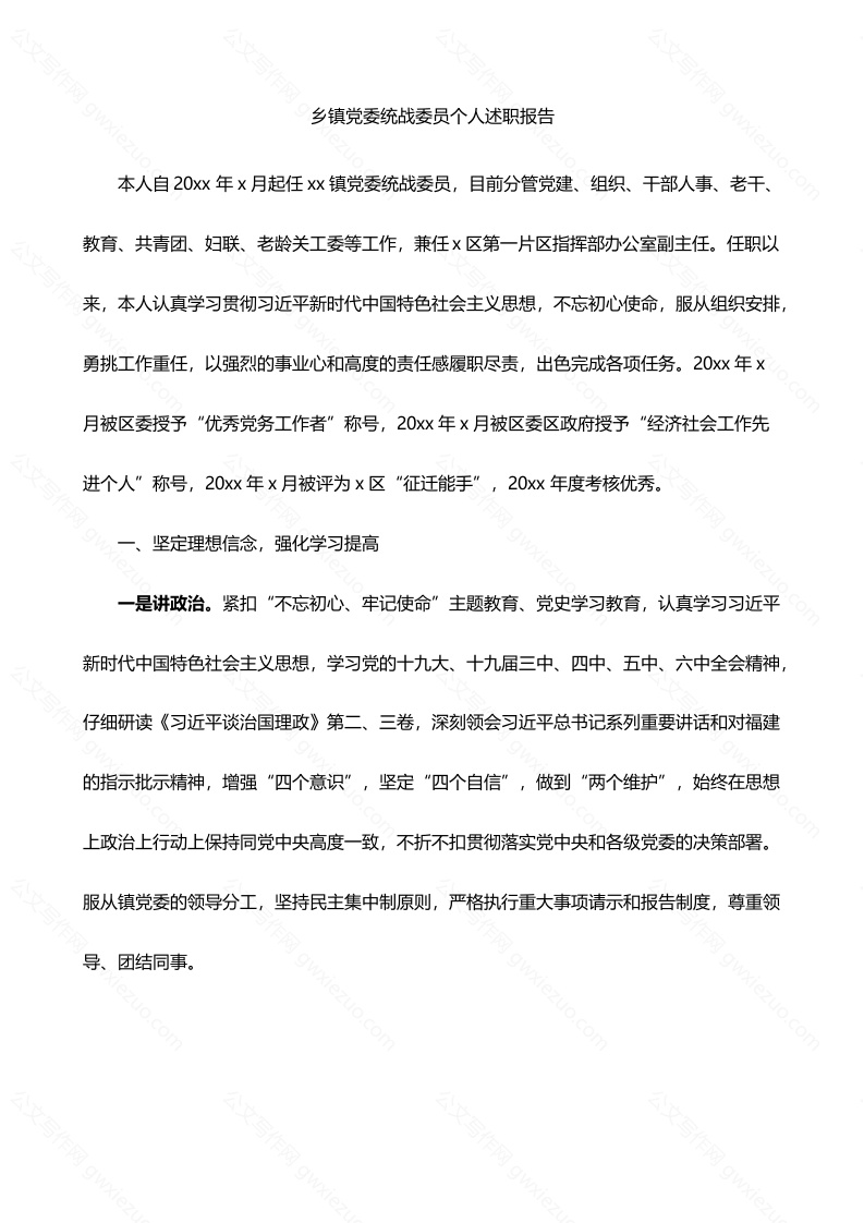 首页讲课讲稿乡镇党委统战委员2021年个人述职报告