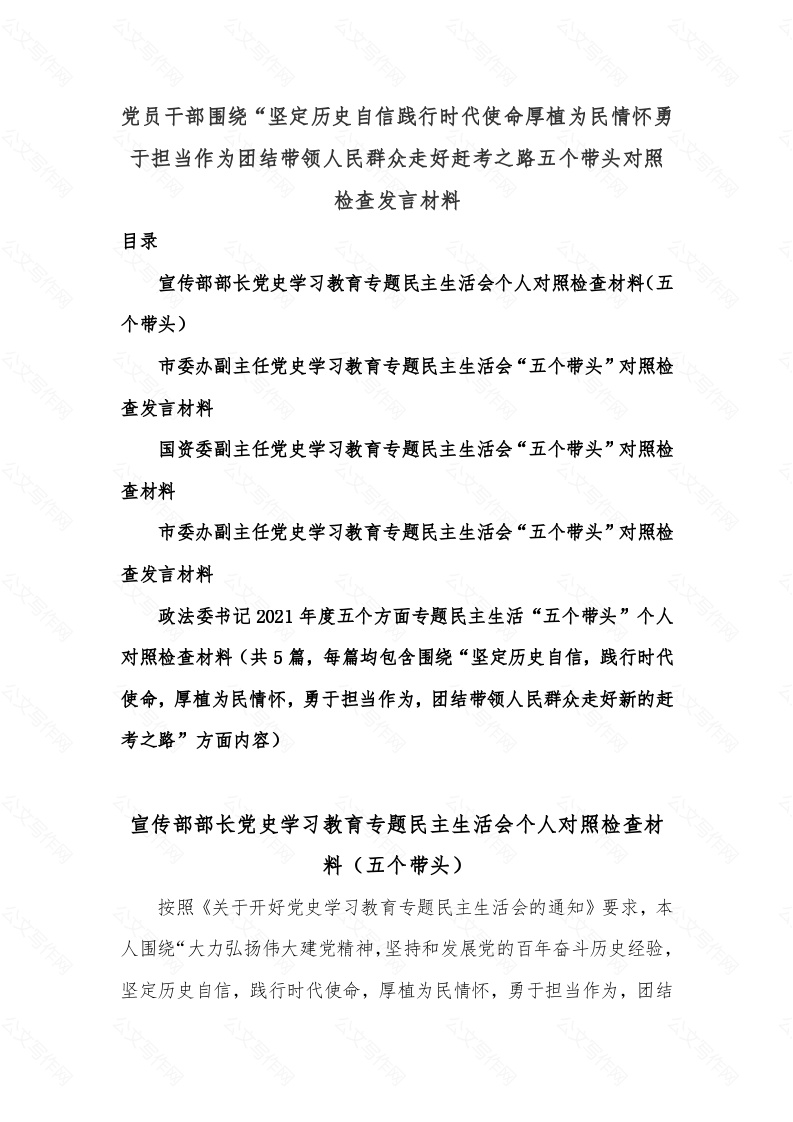 首页材料汇编(5篇)党员干部围绕“坚定历史自信践行时代使命厚植为民情怀勇于担当作为团结带领人民群众走好赶考之路五个带头对照检查发言材料