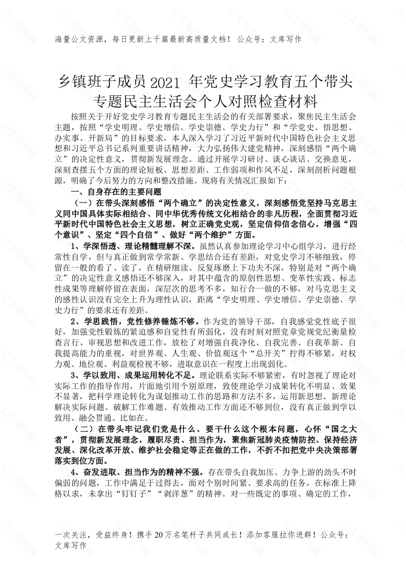 首页工作文档乡镇班子成员2021年党史学习教育五个带头专题民主生活会个人对照检查材料