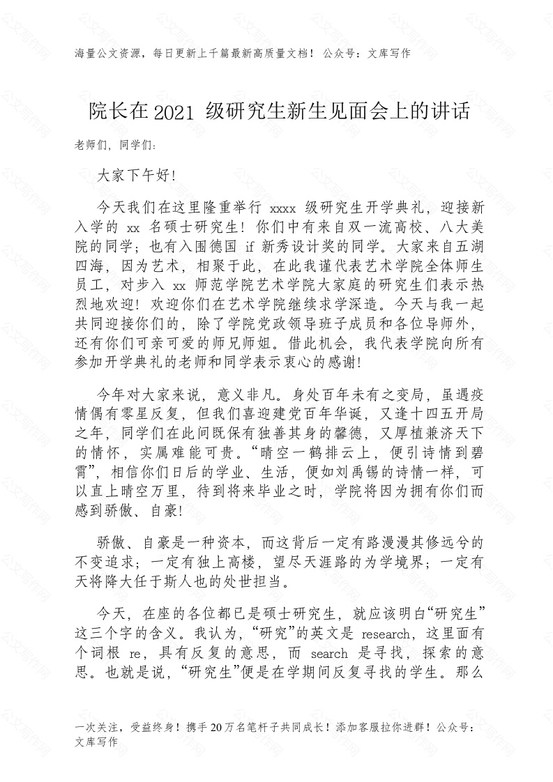 首页工作文档院长在2021级研究生新生见面会上的讲话