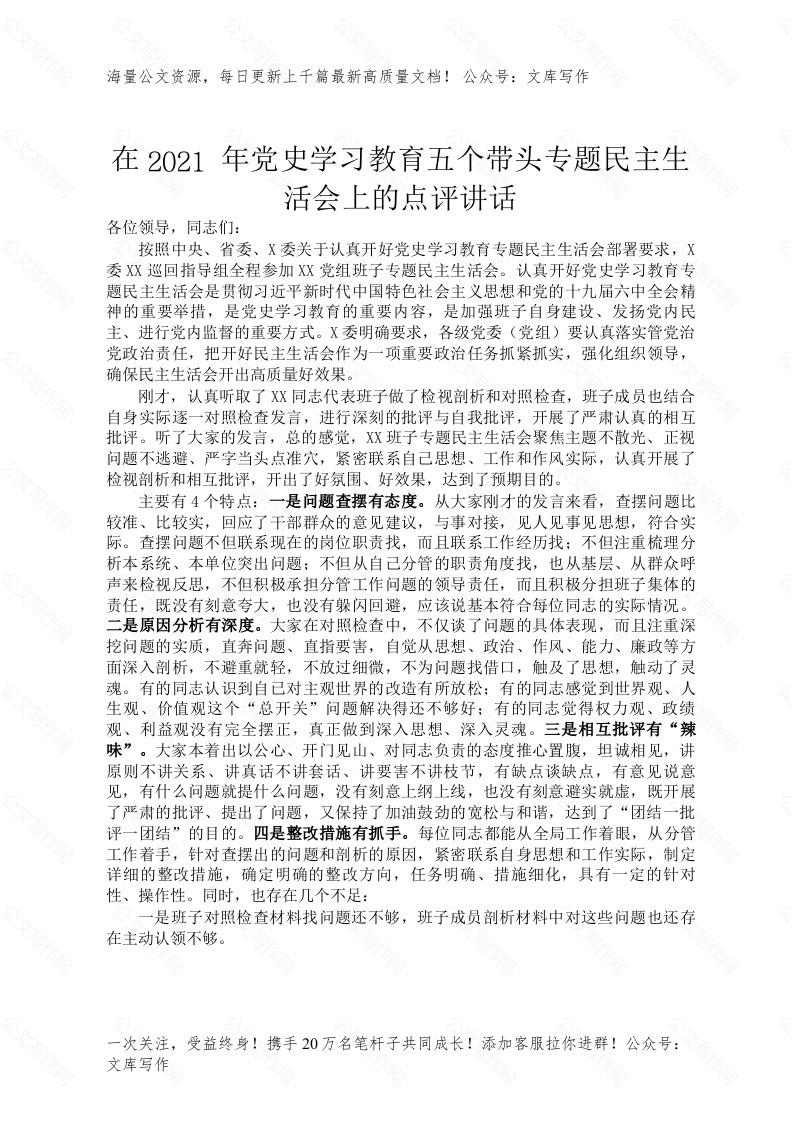 首页工作文档在2021年党史学习教育五个带头专题民主生活会上的点评讲话