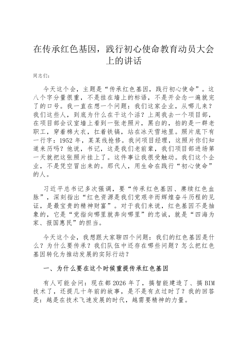 在传承红色基因,践行初心使命教育动员大会上的讲话