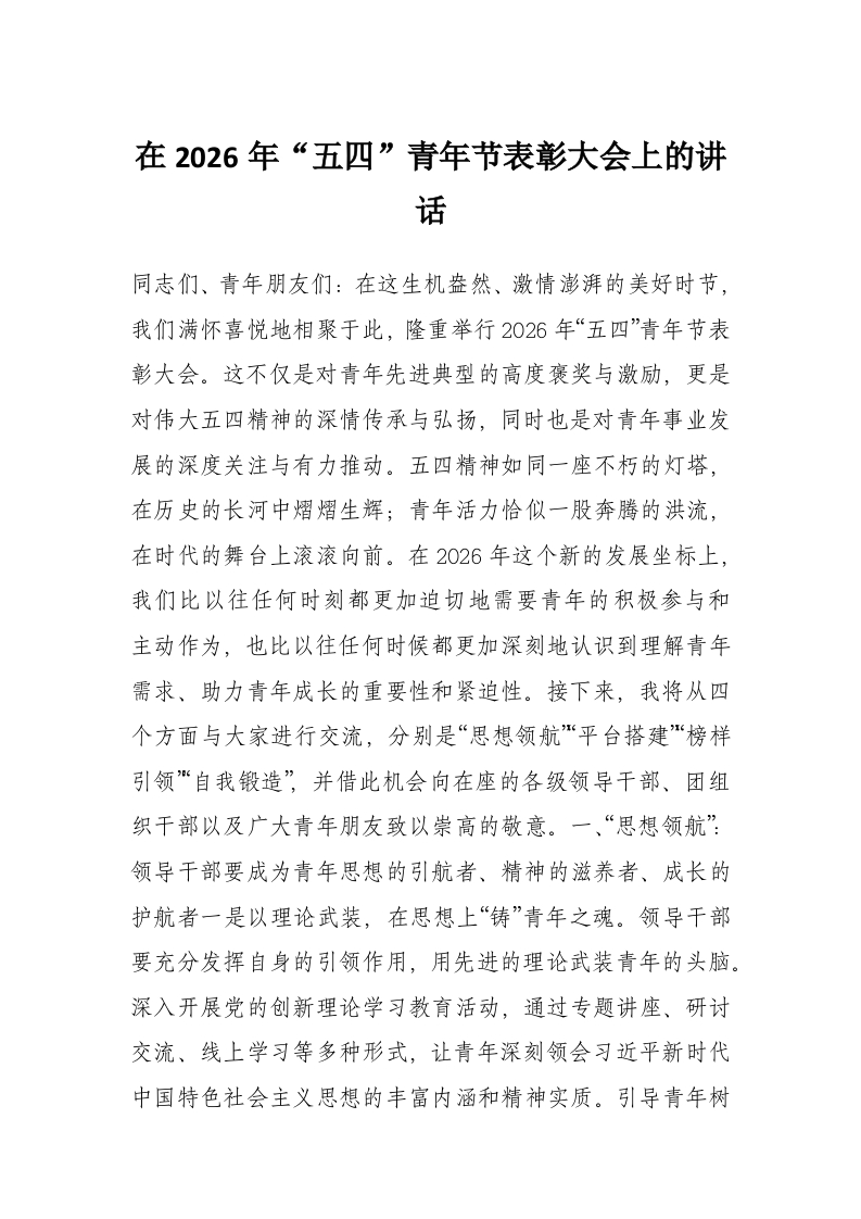 在2026年“五四”青年节表彰大会上的讲话