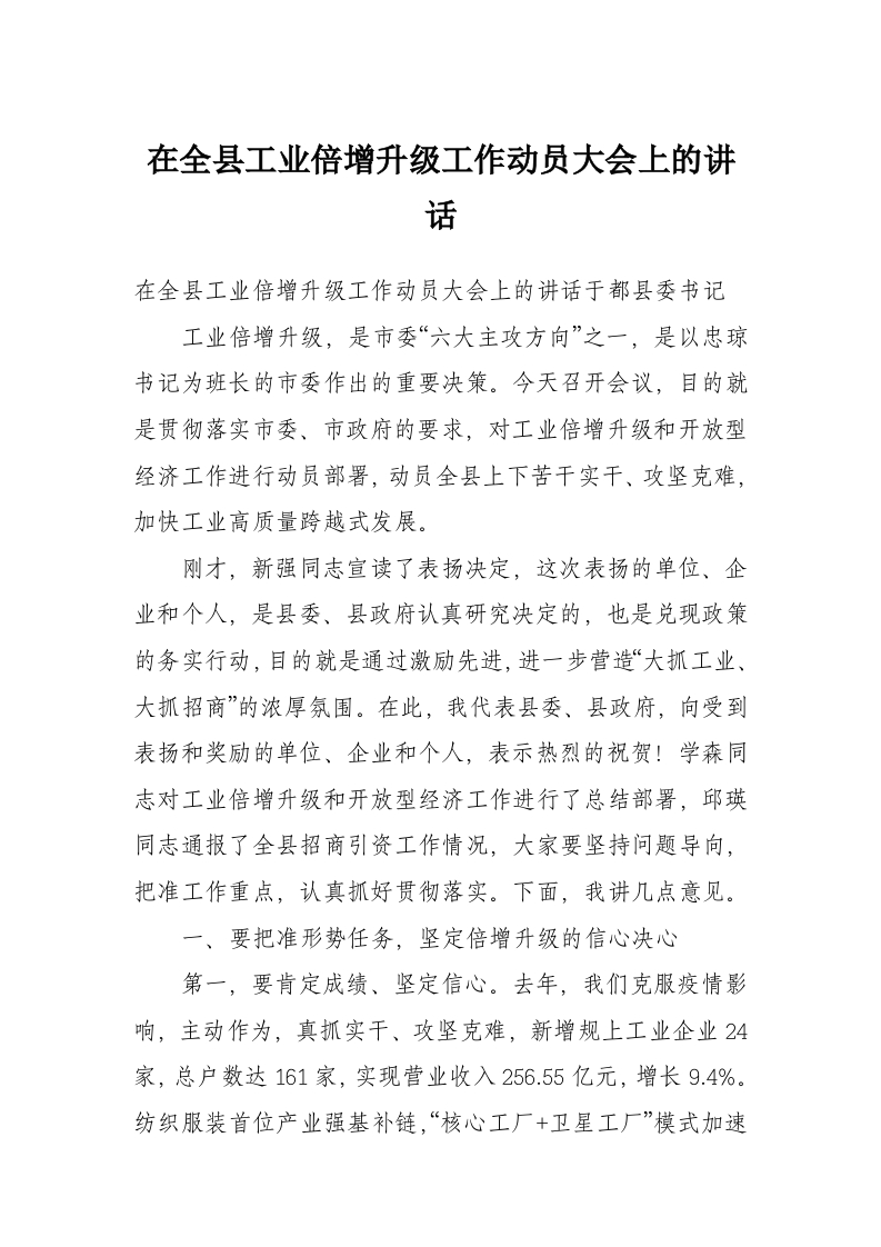 在全县工业倍增升级工作动员大会上的讲话