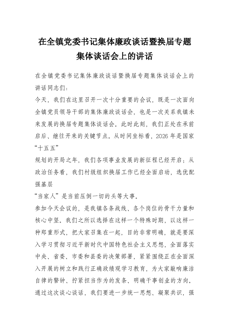 在全镇党委书记集体廉政谈话暨换届专题集体谈话会上的讲话