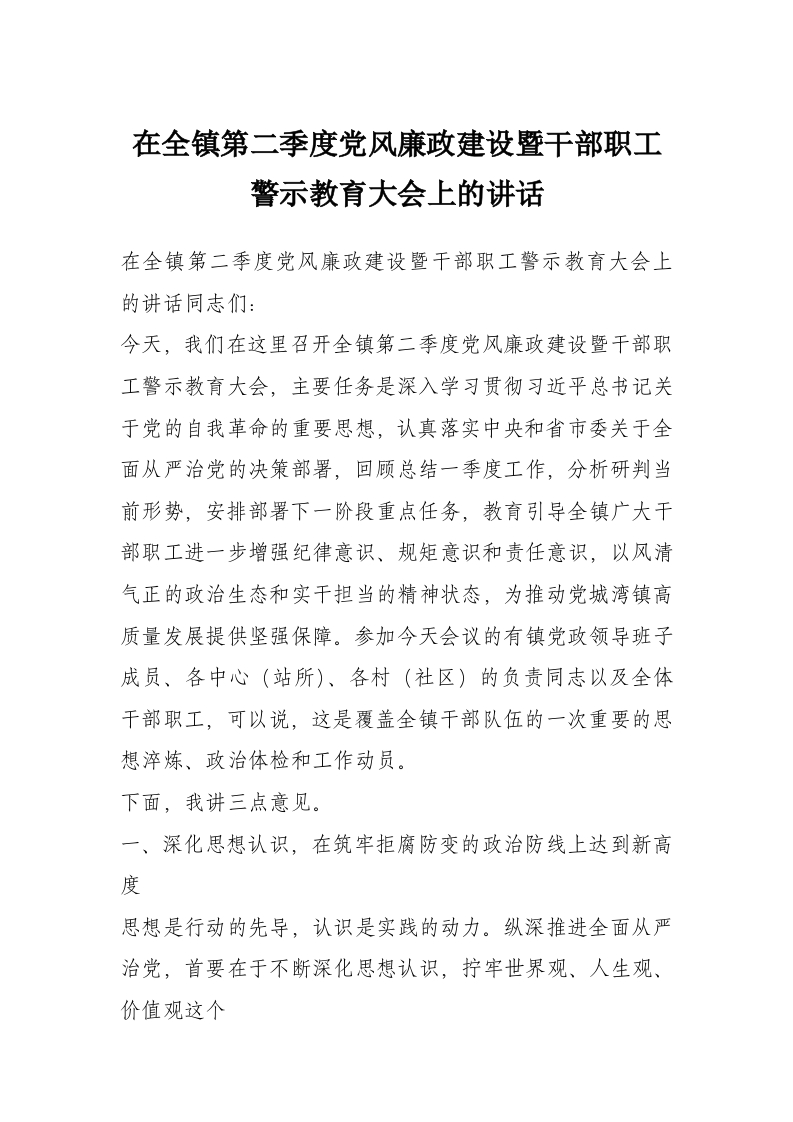 在全镇第二季度党风廉政建设暨干部职工警示教育大会上的讲话