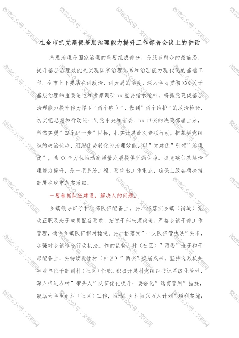 在全市抓党建促基层治理能力提升工作部署会议上的讲话