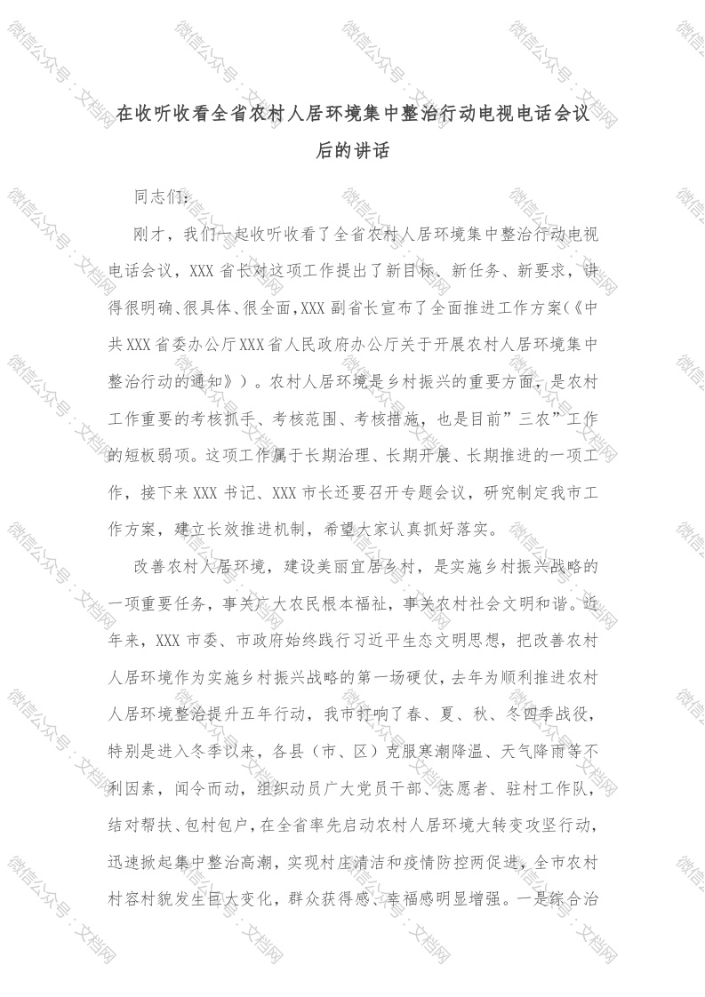 在收听收看全省农村人居环境集中整治行动电视电话会议后的讲话