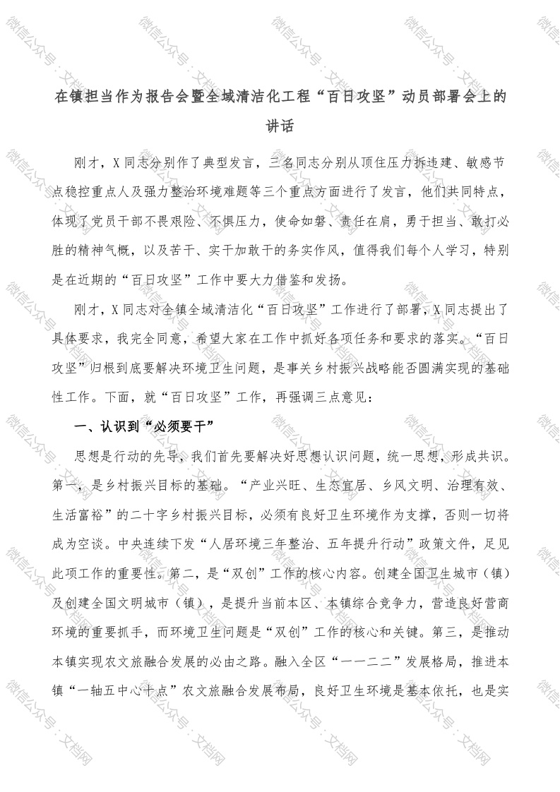 首页写作素材在镇担当作为报告会暨全域清洁化工程“百日攻坚”动员部署会上的讲话