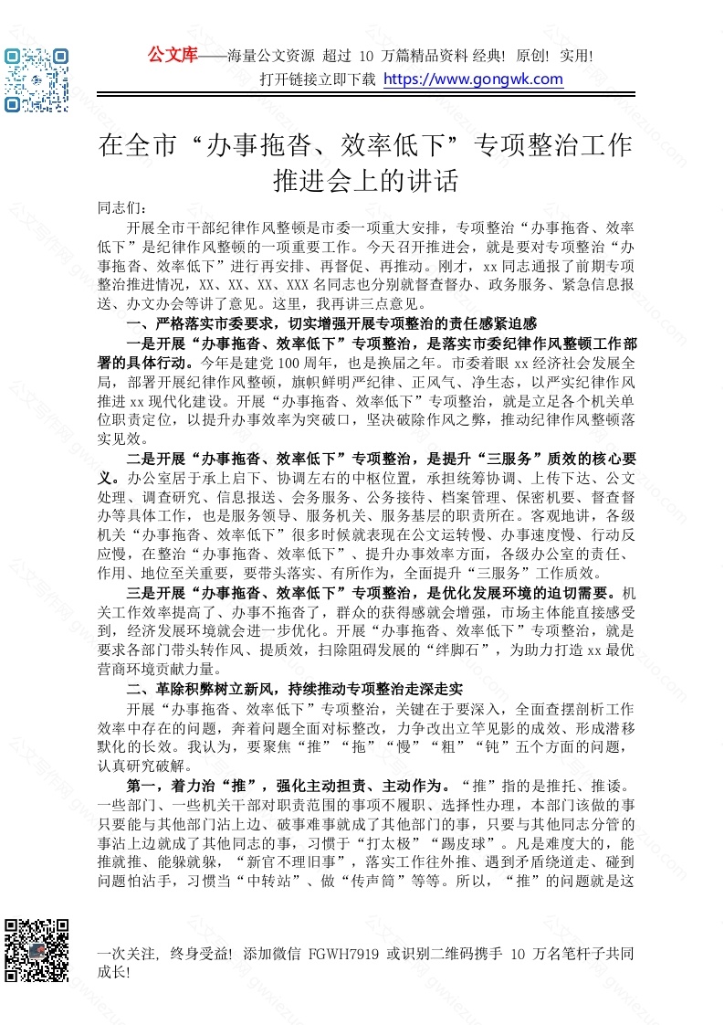 首页工作文档在全市“办事拖沓、效率低下”专项整治工作推进会上的讲话