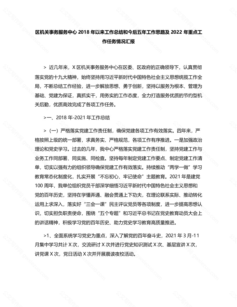 区机关事务服务中心2018年以来工作总结和今后五年工作思路及2022年重点工作任务情况汇报